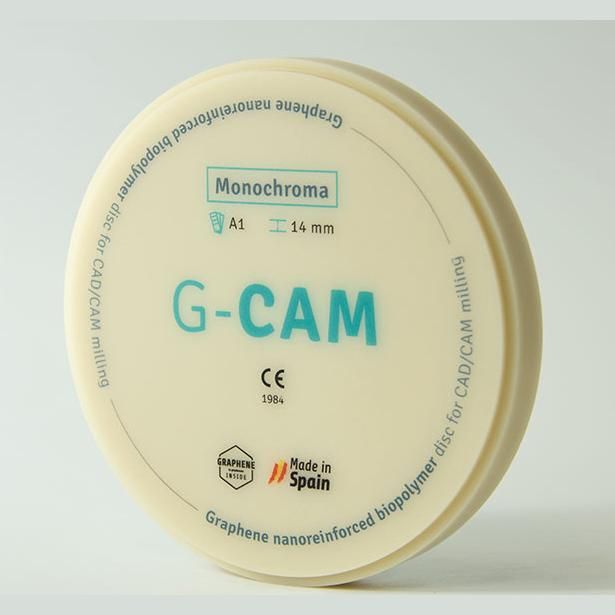 Los discos de biopolímero nanorreforzado con grafeno G-CAM presentan un aumento de la flexibilidad y de la dureza superficial. Su peso específico es igual al de la dentición natural. Permiten una distribución equitativa de la carga masticatoria y la absorción de las cargas oclusales externas. Material específico para prótesis dentales definitivas. Disponible en una alta gama cromática, según la guía VITA Classical (9 colores).